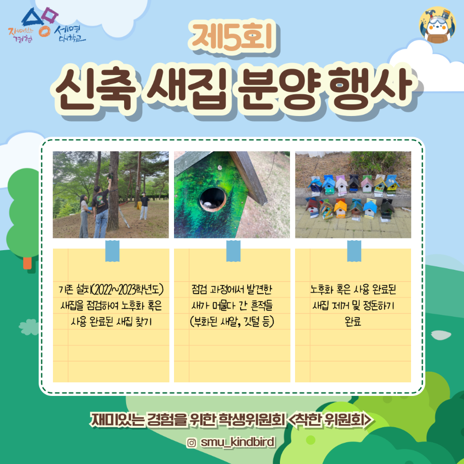 - 2024학년도 1학기 착한 위원회 활동을 통해 제작한 새집 설치(13개)