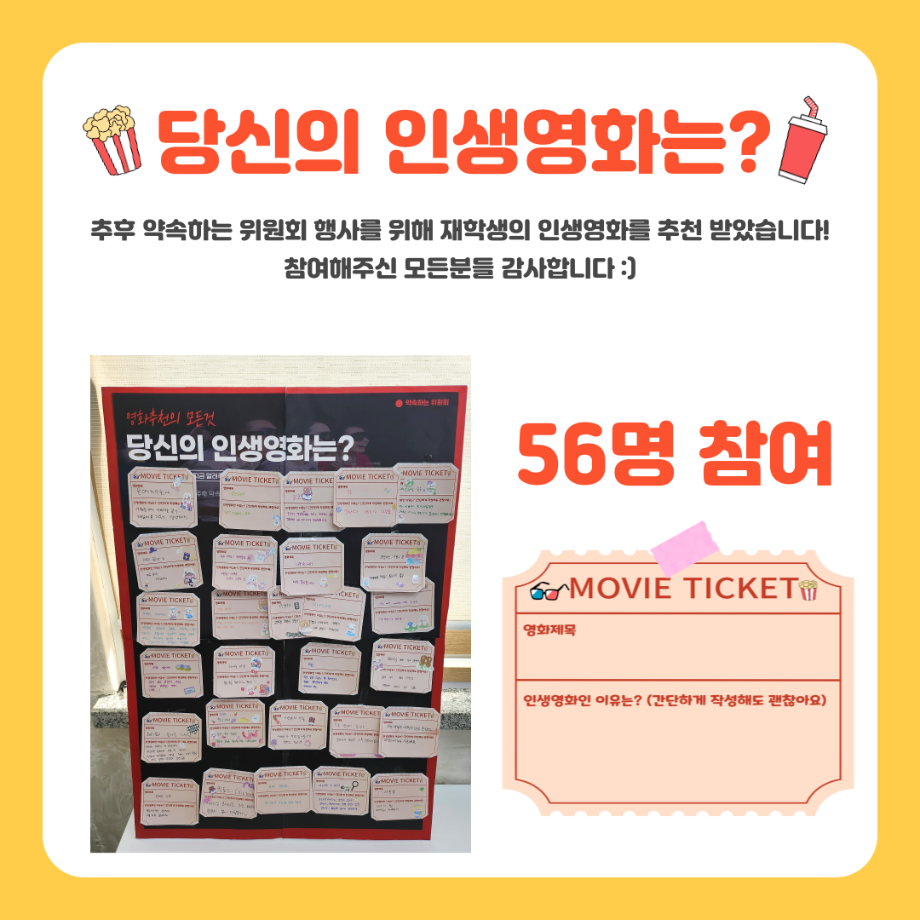 재학생 여러분이 추천해주신 인생영화는 추후 약속하는 위원회 행사에 활용될 예정입니다 :)