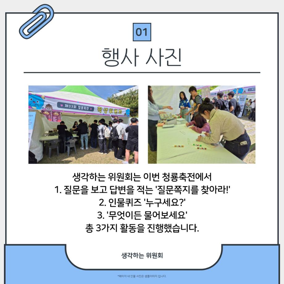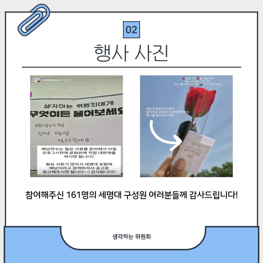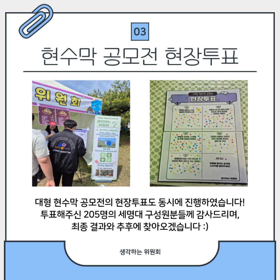 본문 시작 홈으로 포토갤러리 학생위원회 개요 학생위원회 소개 공지사항 활동결과 홈페이지가이드 포토갤러리 페이스북 트위터 프린트 [생각하는 위원회]생각 다락방 학술정보원 1286 2025-05-22 프로그램명 : 생각 다락방 일시 : 2025.05.14(수) 13:30~17:00 장소 : 뭐든지 광장 학생위원회 부스 활동내용 : 질문쪽지 찾기, 인물퀴즈, 무엇이든 물어보세요, 대형현수막 공모전 현장투표 참여인원 : 부스 행사 161명 참여, 대형현수막 공모전 현장투표 205명 참여 대형현수막 공모전 현장투표는 추후에 최종 결과를 만나보실 수 있습니다🤍 앞으로도 생각하는 위원회와 함께 해요! 목록 이전[약속하는 위원회] 빛나는 약속 이전[꽃피는 위원회] 제4회 벚꽃축제 '벚꽃세봄' 담당부서 : 장학복지팀 담당자 : - 연락처 : 043-649-1142 최종수정일 : 2024-10-26 만족도조사 만족도 조사 이 페이지에서 제공하는 정보에 대하여 만족하시나요? 매우만족 만족 보통 불만족 매우불만족