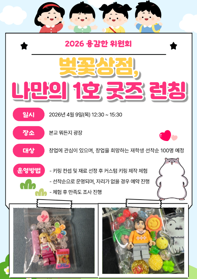 본문 시작 홈으로 공지사항 학생위원회 개요 학생위원회 소개 공지사항 활동결과 홈페이지가이드 프로그램 계획 프로그램 계획 세명대학교 공지사항 프로그램 계획 페이스북 트위터 프린트 [용감한 위원회] 벚꽃상점, 나만의 1호 굿즈 런칭 취창업지원처 16 2026-04-09 [용감한 위원회] 벚꽃상점, 나만의 1호 굿즈 런칭 1. 운영일자: 2026. 4. 9.(목) 12:30 ~ 15:30 2. 운영장소: 뭐든지 광장 3. 운영대상: 창업에 관심이 있으며 창업을 희망하는 재학생 및 교직원 등(선착순 100명!!) 4. 운영방법: 키링 컨셉 및 개료 재료 선정 후 키링 제작 체험 용감한 위원회에서 체험부스를 운영합니다! 본교 재학생 및 교직원께서는 많은 관심과 참여 부탁드립니다!! 💗💗 목록 이전제 4회 학생위원회 최종보고회 시행 이전[꽃피는 위원회] 제 5회 세명대학교 벚꽃축제 벚꽃세봄 담당부서 : 장학복지팀 담당자 : - 연락처 : 043-649-1142 최종수정일 : 2024-10-26 만족도조사 만족도 조사 이 페이지에서 제공하는 정보에 대하여 만족하시나요? 매우만족 만족 보통 불만족 매우불만족