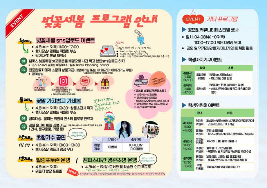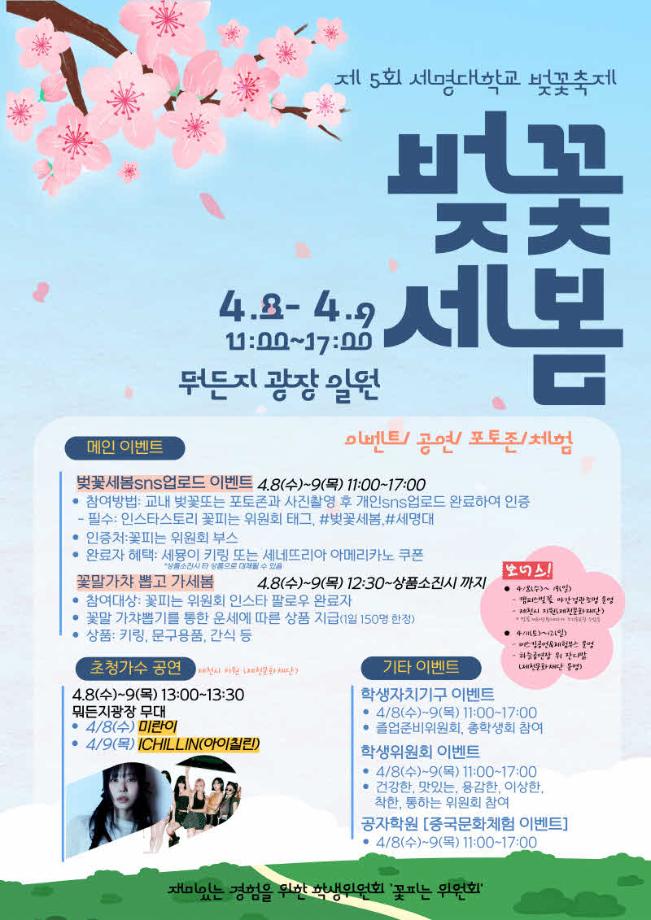 본문 시작 홈으로 공지사항 학생위원회 개요 학생위원회 소개 공지사항 활동결과 홈페이지가이드 프로그램 계획 프로그램 계획 세명대학교 공지사항 프로그램 계획 페이스북 트위터 프린트 [꽃피는 위원회] 제 5회 세명대학교 벚꽃축제 벚꽃세봄 학생처 18 2026-04-08 세명대학교 제 5회 벚꽃축제 [벚꽃세봄] 1. 일시:2026.04.08(수)~09(목) 2. 장소:뭐든지광장 일원 3. 내용: 포토존, 공연, 이벤트, 처험 등 각종 프로그램 진행 * 제 11회 커뮤니티 페스티벌과 함께 진행 목록 다음 [용감한 위원회] 벚꽃상점, 나만의 1호 굿즈 런칭 이전[생각하는 위원회] 현수막 공모전: 너도 도전해봐! 무한도전!🫧 담당부서 : 장학복지팀 담당자 : - 연락처 : 043-649-1142 최종수정일 : 2024-10-26 만족도조사 만족도 조사 이 페이지에서 제공하는 정보에 대하여 만족하시나요? 매우만족 만족 보통 불만족 매우불만족