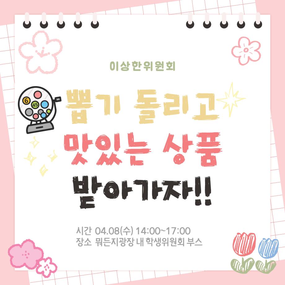 본문 시작 홈으로 공지사항 학생위원회 개요 학생위원회 소개 공지사항 활동결과 홈페이지가이드 프로그램 계획 프로그램 계획 세명대학교 공지사항 프로그램 계획 페이스북 트위터 프린트 [이상한 위원회] 봄바람 타고 온 달콤함 학생처 42 2026-04-08 <특별메뉴 추천 및 학생식당 개선의견 수렴행사> 1. 일시: 2026.04.08(스) 14:00`17:00 2. 장소: 뭐든지 광장 학생위원회 부스 3. 참여방법: 이상한 위원회 인스타 팔로우 하고 의견제시(포스트잇 부착 및 설문조사) 후 간식받자 목록 이전[이상한 위원회] 벚꽃 포토존 운영 담당부서 : 장학복지팀 담당자 : - 연락처 : 043-649-1142 최종수정일 : 2024-10-26 만족도조사 만족도 조사 이 페이지에서 제공하는 정보에 대하여 만족하시나요? 매우만족 만족 보통 불만족 매우불만족