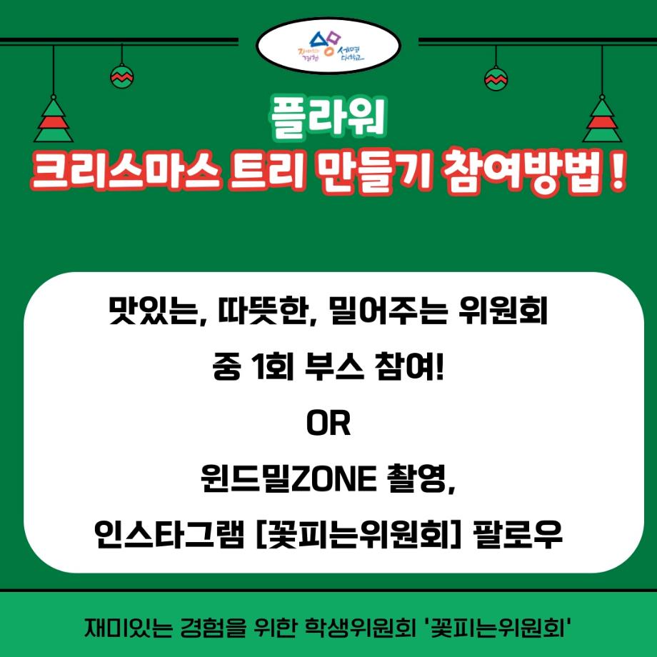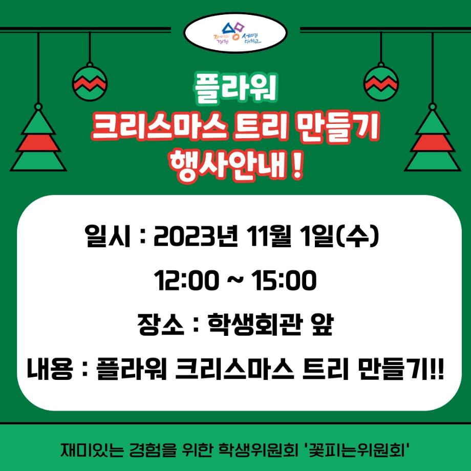 본문 시작 홈으로 공지사항 학생위원회 개요 학생위원회 소개 공지사항 활동결과 홈페이지가이드 프로그램 계획 프로그램 계획 세명대학교 공지사항 프로그램 계획 페이스북 트위터 프린트 [꽃피는 위원회] 플라워트리 만들기 학생처 2498 2023-11-01 미리크리스마스 플라워트리만들기 행사 일시 : 2023.11.01 12:00 ~ 15:00 장소 : 학생회관 앞 광장 목록 이전[통하는 위원회] MZ골든벨 다음 [따뜻한 위원회] 따뜻한 마음은 참(charm) 좋아 담당부서 : 장학복지팀 담당자 : - 연락처 : 043-649-1142 최종수정일 : 2024-10-26 만족도조사 만족도 조사 이 페이지에서 제공하는 정보에 대하여 만족하시나요? 매우만족 만족 보통 불만족 매우불만족