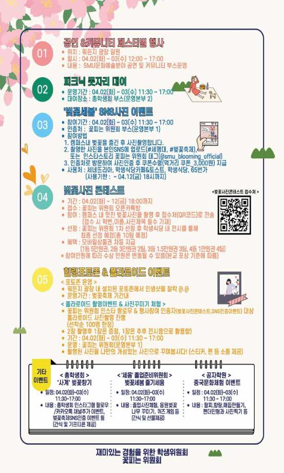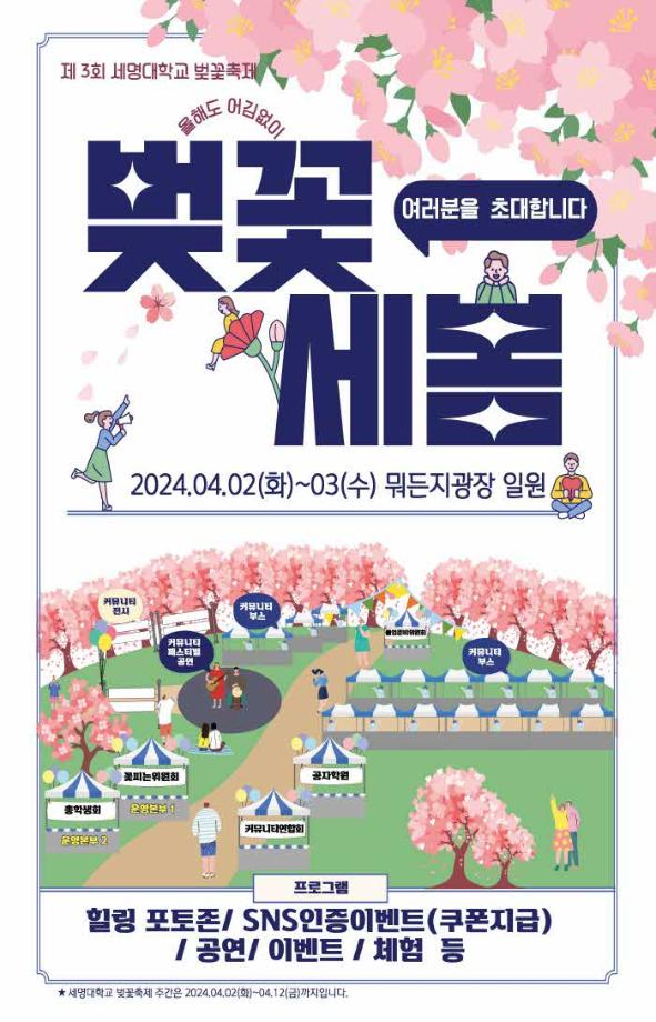 본문 시작 홈으로 공지사항 학생위원회 개요 학생위원회 소개 공지사항 활동결과 홈페이지가이드 프로그램 계획 프로그램 계획 세명대학교 공지사항 프로그램 계획 페이스북 트위터 프린트 [꽃피는 위원회]제 3회 벚꽃축제 진행 학생처 1731 2024-04-02 2024년 세명대학교 제 3회 벚꽃축제를 진행합니다. 벚꽃사진콘테스트, sns사진업로드 이벤트, 폴라로이드이벤트 등 여러가지 프로그램을 실시하오니 많은 참여부탁드립니다. 목록 이전[생각하는 위원회] 제 3차 생각게시판 운영 다음 [약속하는 위원회] 2024년도 약속상점 운영안내 담당부서 : 장학복지팀 담당자 : - 연락처 : 043-649-1142 최종수정일 : 2024-10-26 만족도조사 만족도 조사 이 페이지에서 제공하는 정보에 대하여 만족하시나요? 매우만족 만족 보통 불만족 매우불만족