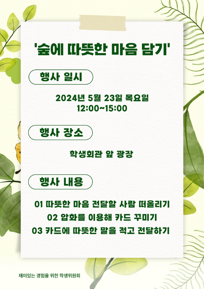 본문 시작 홈으로 공지사항 학생위원회 개요 학생위원회 소개 공지사항 활동결과 홈페이지가이드 프로그램 계획 프로그램 계획 세명대학교 공지사항 프로그램 계획 페이스북 트위터 프린트 [따뜻한 위원회] 숲에 따뜻한 마음 담기 학생처 1411 2024-05-23 [숲에 따뜻한 마음 담기] 일시 : 2024.05.23(목) 장소 : 학생회관 앞 광장 내용 - 따뜻한 마음 전달할 사람 떠올리기 - 압화를 이용한 카드 꾸미기 - 카드에 따뜻한 말 적고 전달하기 목록 이전[맛있는 위원회] 맞그램 틀렸그램 다음 [통하는 위원회] 🔔 MZ 골든벨 개최 🔔 담당부서 : 장학복지팀 담당자 : - 연락처 : 043-649-1142 최종수정일 : 2024-10-26 만족도조사 만족도 조사 이 페이지에서 제공하는 정보에 대하여 만족하시나요? 매우만족 만족 보통 불만족 매우불만족