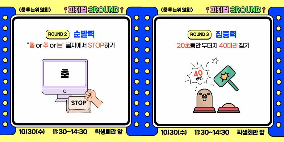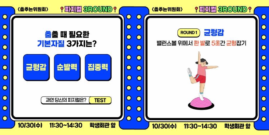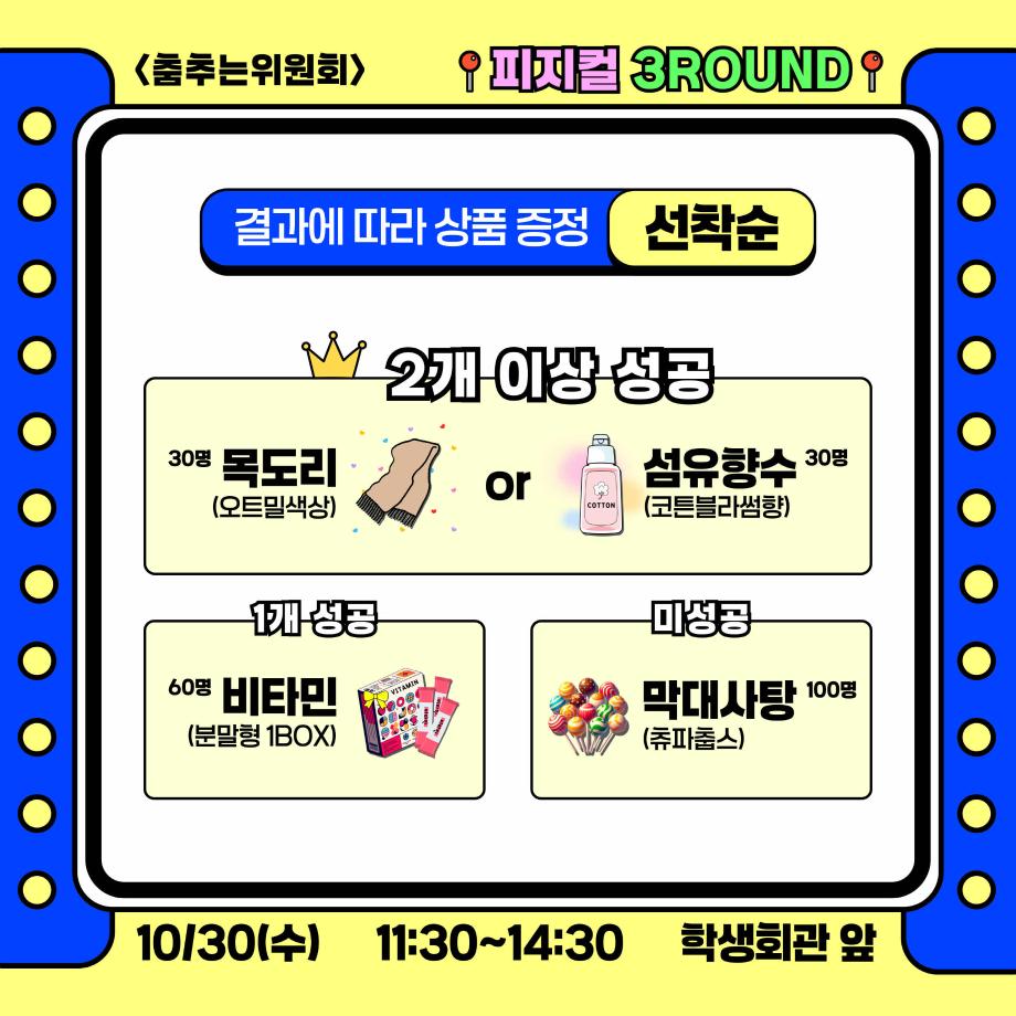 본문 시작 홈으로 공지사항 학생위원회 개요 학생위원회 소개 공지사항 활동결과 홈페이지가이드 프로그램 계획 프로그램 계획 세명대학교 공지사항 프로그램 계획 페이스북 트위터 프린트 [춤추는 위원회]피지컬3ROUND 학생처 1381 2024-10-30 [춤추는 위원회] 피지컬3ROUND 춤출 때 필요한 기본자질테스트 1. 균형감 : 밸런스볼 위에서 한발로 5초간 균형잡기 2. 순발력 : 춤OR 추OR 는 글자에서 STOP하기 3. 집중력 : 20초동안 두더지 40만리 잡기 참여결과에 따라 상품증정(선착순)하니 많은 참여부탁드립니다. 목록 이전-용감한 위원회] 도전! 인테리어창업 다음 [벗어나는 위원회] 벗어나는 위원회와 함께하는 스트레스를 벗어나자! 담당부서 : 장학복지팀 담당자 : - 연락처 : 043-649-1142 최종수정일 : 2024-10-26 만족도조사 만족도 조사 이 페이지에서 제공하는 정보에 대하여 만족하시나요? 매우만족 만족 보통 불만족 매우불만족