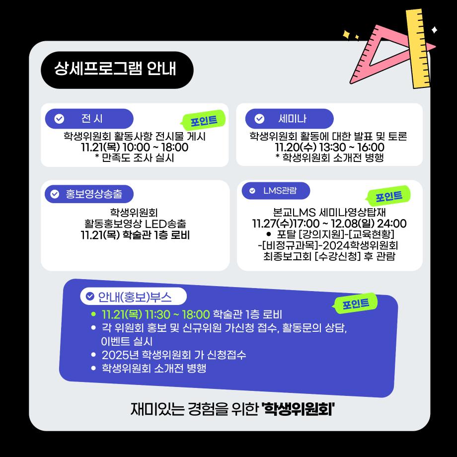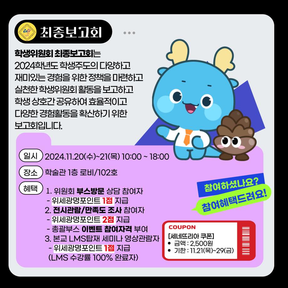 본문 시작 홈으로 공지사항 학생위원회 개요 학생위원회 소개 공지사항 활동결과 홈페이지가이드 프로그램 계획 프로그램 계획 세명대학교 공지사항 프로그램 계획 페이스북 트위터 프린트 학생위원회 최종보고회 학생처 1820 2024-11-20 < 학생위원회 최종보고회 > 일시 : 2024.11.20(수)~21(목) 장소 : 학술관 1층 로비 내용 : 활동실적 발표(세미나), 위원회 소개전, 활동실적 전시(전시), 안내(홍보)부스 진행, 개별 프로그램 진행 목록 이전[이상한 위원회] 이상하거나 '이'상하거나 다음 [따뜻한 위원회] 넌 이름이 뭐니? 담당부서 : 장학복지팀 담당자 : - 연락처 : 043-649-1142 최종수정일 : 2024-10-26 만족도조사 만족도 조사 이 페이지에서 제공하는 정보에 대하여 만족하시나요? 매우만족 만족 보통 불만족 매우불만족