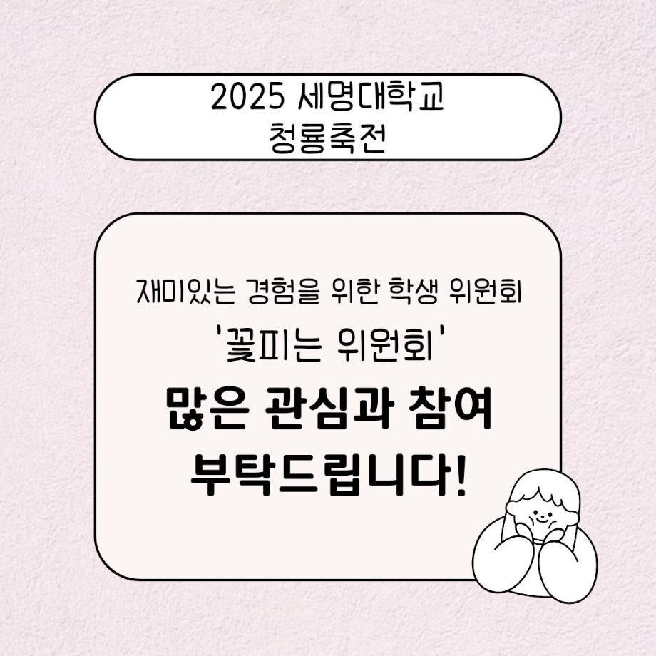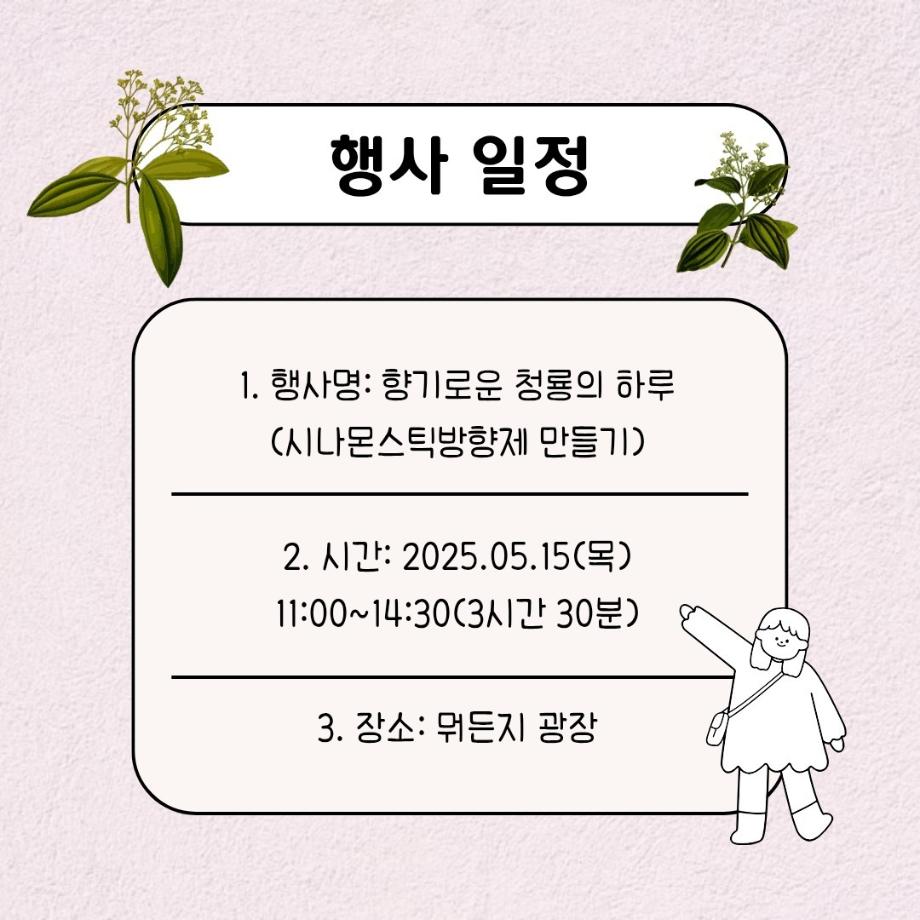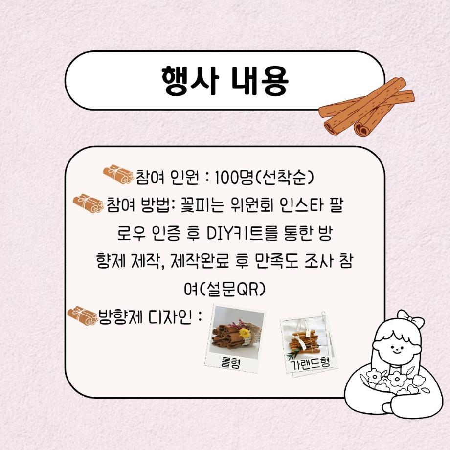 본문 시작 홈으로 공지사항 학생위원회 개요 학생위원회 소개 공지사항 활동결과 홈페이지가이드 프로그램 계획 프로그램 계획 세명대학교 공지사항 프로그램 계획 페이스북 트위터 프린트 [꽃피는 위원회] 향기로운 청룡의 하루(시나몬스틱 방향제 만들기) 학생처 689 2025-05-15 [향기로운 청룡의 하루(시나몬스틱 방향제 만들기) 1)일시: 2025.05.15(목) 11:00~14:30 2)장소: 뭐든지 광장 학생위원회 부스 3)대상: 본교 구성원 100명 한정 4)내용 : 꽃피는 위원회 인스타 팔로우 인증 -> 참여키트 수령 후 참여 -> 참여완료자 설문조사 참여(참여사진 업로드) -> 완료 많은 참여부탁드립니다. 목록 이전[용감한 위원회] 세명상점 다음 [착한 위원회] 향기를 담다 나를 담다 담당부서 : 장학복지팀 담당자 : - 연락처 : 043-649-1142 최종수정일 : 2024-10-26 만족도조사 만족도 조사 이 페이지에서 제공하는 정보에 대하여 만족하시나요? 매우만족 만족 보통 불만족 매우불만족
