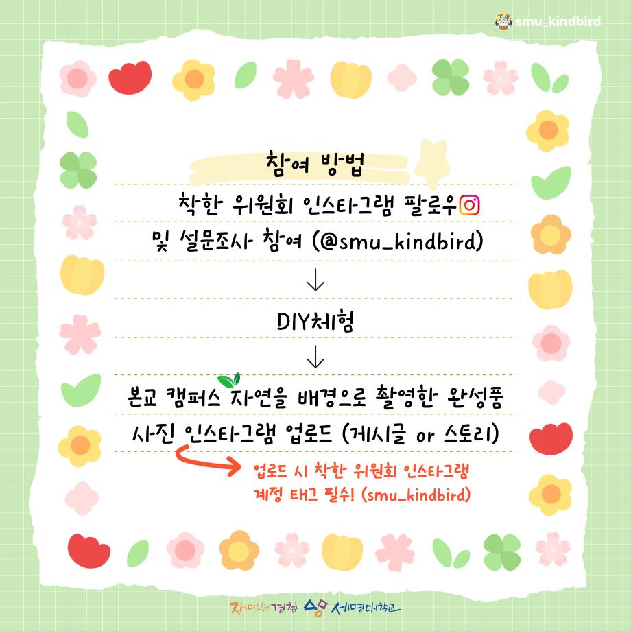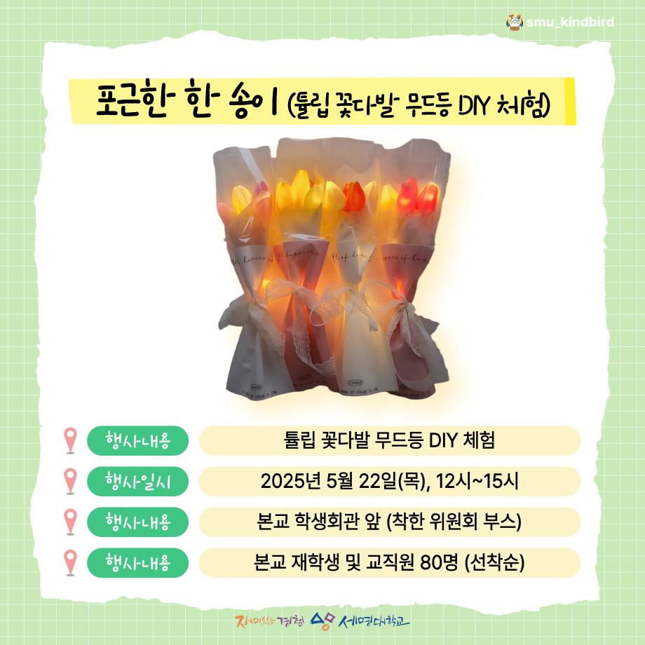 본문 시작 홈으로 공지사항 학생위원회 개요 학생위원회 소개 공지사항 활동결과 홈페이지가이드 프로그램 계획 프로그램 계획 세명대학교 공지사항 프로그램 계획 페이스북 트위터 프린트 [착한 위원회] 포근한 한 송이 학생처 1112 2025-05-22 1. 행사일시 ■ 2025년 5월 22일(목), 12시~15시 2. 행사장소 ■ 본교 학생회관 앞 3. 행사내용 ■ 튤립 꽃다발 무드등 DIY 체험 및 착한 위원회 관련 설문조사 4. 참여대상 ■ 본교 재학생 및 교직원 80명(선착순) 목록 이전[착한 위원회] 향기를 담다 나를 담다 다음 [꽃피는 위원회] 제4회 사랑의 꽃집사 이벤트 담당부서 : 장학복지팀 담당자 : - 연락처 : 043-649-1142 최종수정일 : 2024-10-26 만족도조사 만족도 조사 이 페이지에서 제공하는 정보에 대하여 만족하시나요? 매우만족 만족 보통 불만족 매우불만족