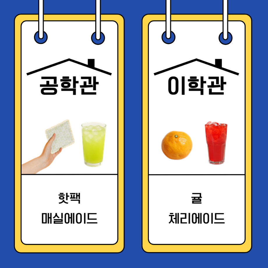 본문 시작 홈으로 공지사항 학생위원회 개요 학생위원회 소개 공지사항 활동결과 홈페이지가이드 프로그램 계획 프로그램 계획 세명대학교 공지사항 프로그램 계획 페이스북 트위터 프린트 [맛있는 위원회] 숨터에 놀러오세요 학생처 1009 2025-11-18 1. 행사명: 제2차 숨터 활성화 2. 일시: 2025. 11. 18. (화), 13:00 ~ 15:00 3. 장소: 공학관 숨터 및 이학관 숨터 4. 내용: 학관별 물품 나눔 및 추가 물품 비치 가. 학관별 물품 나눔 1) 공학관 숨터: 매실에이드 및 핫팩 2) 이학관 숨터: 체리에이드 및 귤 나. 추가 물품 비치 - 공학과 숨터 및 이학관 숨터에 충전기, 멀티탭, 볼펜, 보드게임 추가 비치 목록 이전[생각하는 위원회/ 약속하는 위원회] 세명파티시에 다음 제 4회 학생위원회 최종보고회 시행 담당부서 : 장학복지팀 담당자 : - 연락처 : 043-649-1142 최종수정일 : 2024-10-26 만족도조사 만족도 조사 이 페이지에서 제공하는 정보에 대하여 만족하시나요? 매우만족 만족 보통 불만족 매우불만족