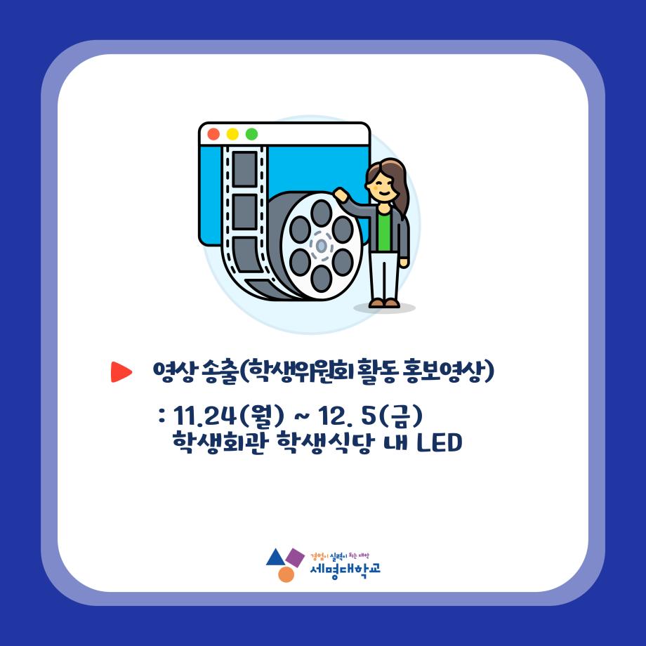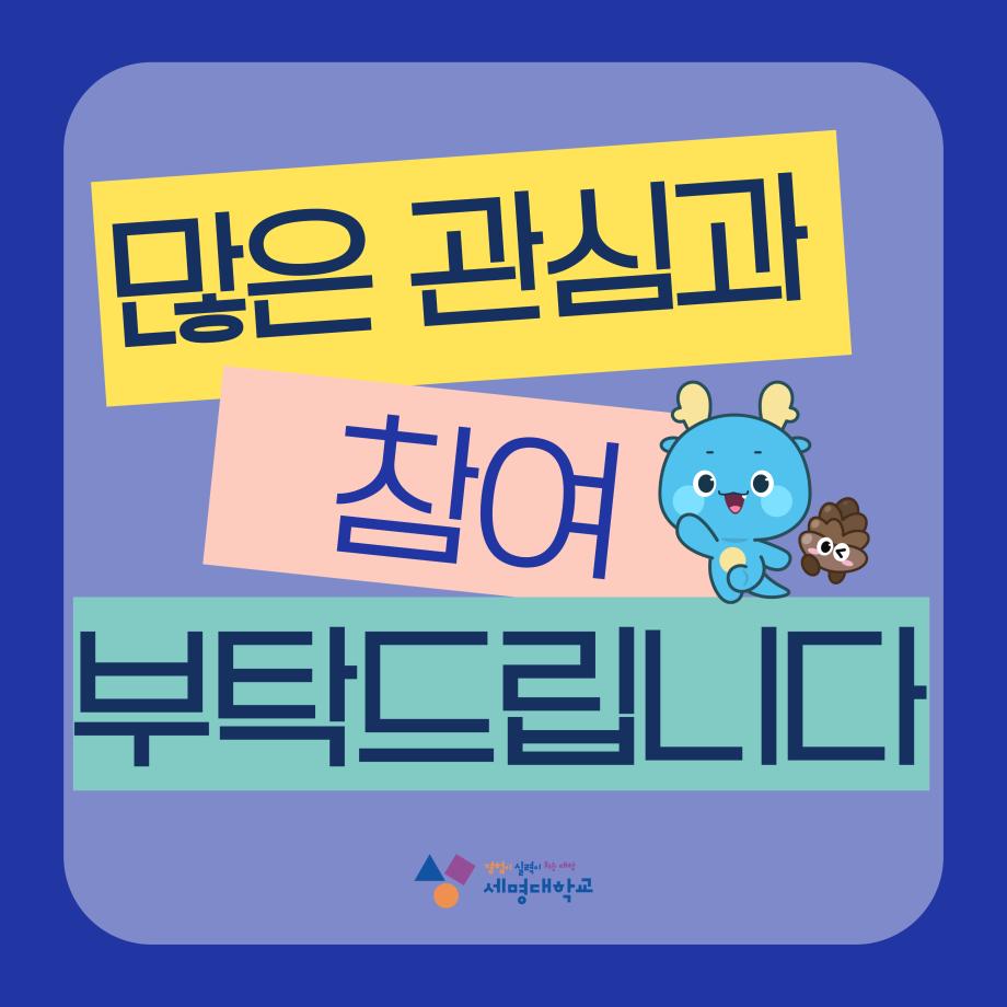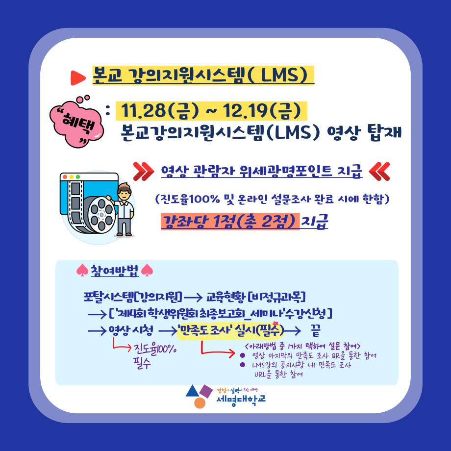 본문 시작 홈으로 공지사항 학생위원회 개요 학생위원회 소개 공지사항 활동결과 홈페이지가이드 프로그램 계획 프로그램 계획 세명대학교 공지사항 프로그램 계획 페이스북 트위터 프린트 제 4회 학생위원회 최종보고회 시행 학생처 1044 2025-11-20 <제 4회 학생위원회 최종보고회 안내> 1. 최종보고회 세미나 영상시청 가. 일정: 2025.11.28(금) ~ 12.19(금) 나. 방법: 본교 강의지원시스템(lms) 수강신청 후 영상관람 다. 혜택: 강좌당 위세광명포인트 1점 (총 2개 강좌) 2. 학생위원회 활동홍보 영상송출 가. 일정: 2025. 11. 24(금) ~ 12.5(금) 나. 방법: 학생회관 학생식당 내 설치 LED를 통한 영상송출 목록 이전[맛있는 위원회] 숨터에 놀러오세요 담당부서 : 장학복지팀 담당자 : - 연락처 : 043-649-1142 최종수정일 : 2024-10-26 만족도조사 만족도 조사 이 페이지에서 제공하는 정보에 대하여 만족하시나요? 매우만족 만족 보통 불만족 매우불만족