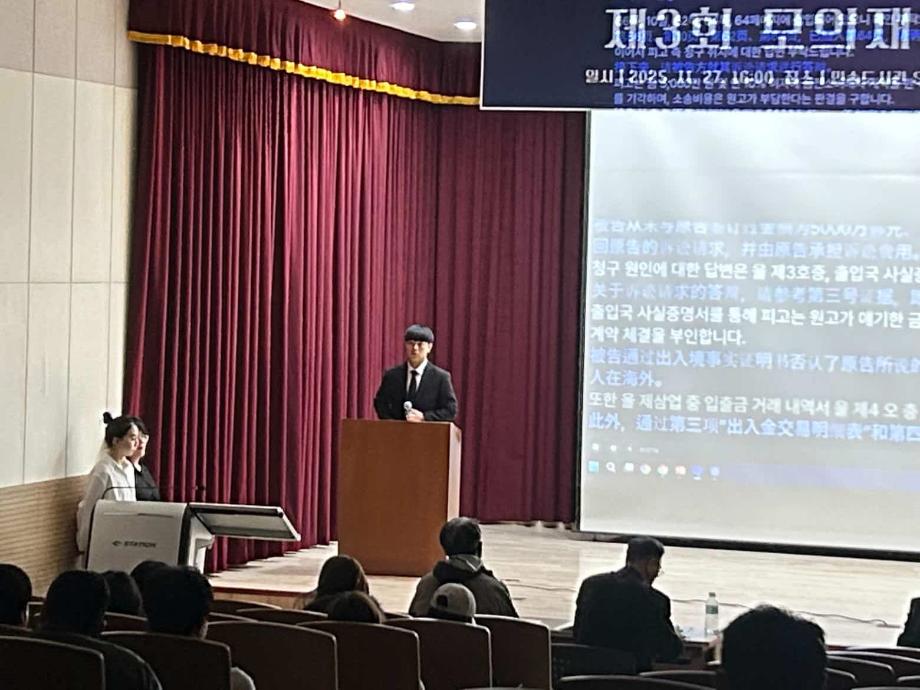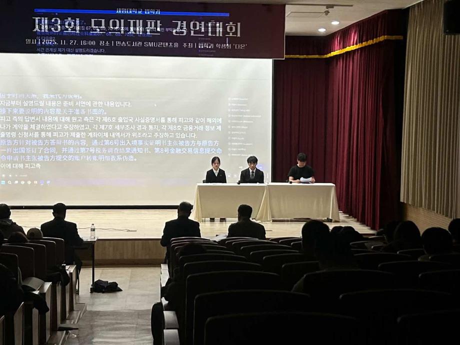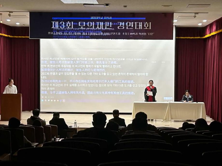 본문 시작 홈으로 커뮤니티 학과안내 교수소개 학과과정 커뮤니티 홈페이지가이드 학과행사 공지사항 취업정보 학과사진첩 학과행사 동아리 학생회 교우소식 모의재판 모의재판 법학학술캠프 법학학술특강 모의재판 페이스북 트위터 프린트 2025학년도 제3회 법학과 모의재판 경연대회 법학과 158 2025-12-17 2025년 11월 27일 민송도서관 1층 콘텐츠홀에서 법학과 모의재판 경연대회 진행하였습니다. 참여하신 모든 분들 고생 많으셨습니다. 목록 이전제2회 모의재판 경영대회 담당부서 : 법학과 담당자 : - 연락처 : 043-649-1764 최종수정일 : 2024-10-26 만족도조사 만족도 조사 이 페이지에서 제공하는 정보에 대하여 만족하시나요? 매우만족 만족 보통 불만족 매우불만족
