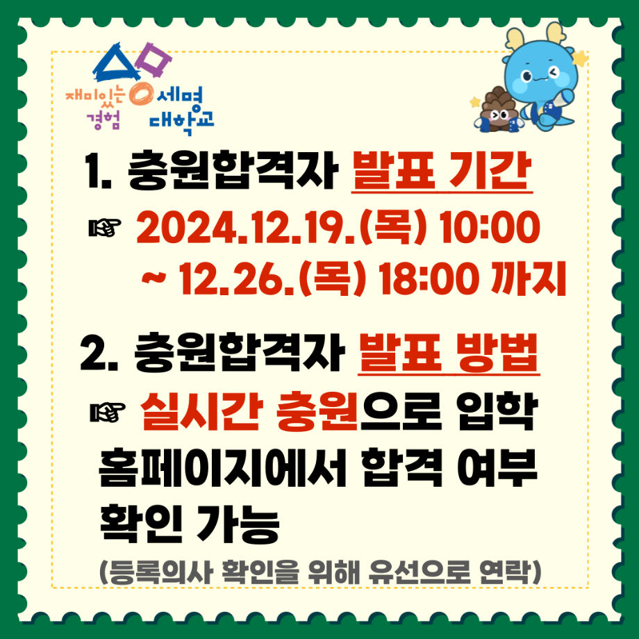 본문 시작 홈으로 커뮤니티 학과소개 교수소개 교육과정 커뮤니티 홈페이지가이드 포토갤러리 학과공지 학사일정 채용정보 및 자료 학생회 포토갤러리 포토갤러리 페이스북 트위터 프린트 세명대학교 재난안전학과 2025학년도 수시모집 충원 합격자 안내 재난안전학과 2728 2024-12-23 세명대학교 재난안전학과 2025학년도 수시모집 충원 합격자 안내 목록 이전세명대학교 재난안전학과 2025학년도 수시모집 최초합격자 등록 안내 다음 세명대학교 2025학년도 정시모집 주요사항 안내 만족도조사 만족도 조사 이 페이지에서 제공하는 정보에 대하여 만족하시나요? 매우만족 만족 보통 불만족 매우불만족