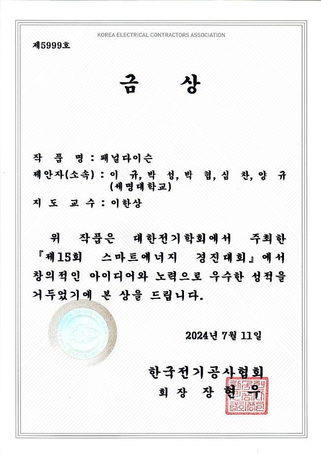 세명대학교 전기공학과 4학년 이O규, 박O협, 양O규, 심O찬, 박O성(지도교수 이한상)의 5명으로 구성된 캡스톤디자인팀(팀명 121호)는, 태양광 패널이 과열되거나 먼지로 오염된 경우 발전 효율이 낮아지는 점을 개선하기 위하여 온도센서와 먼지센서를 이용하여 패널의 온도를 낮추고 먼지를 제거하는 태양광 패널 발전효율 개선 장치(작품명: 패널다이슨)를 제작하여, 대한전기학회에서 주최하는 학부생 대상 스마트에너지경진대회에 참가하였고 전국에서 모인 30개 대학과 경쟁하여 금상(상금 60만원)을 수상하였다.