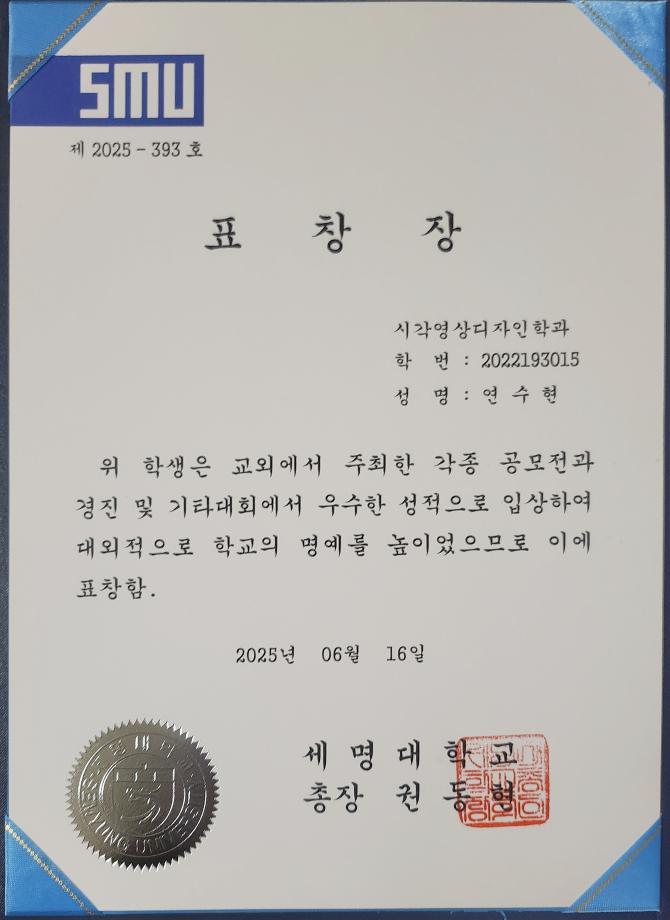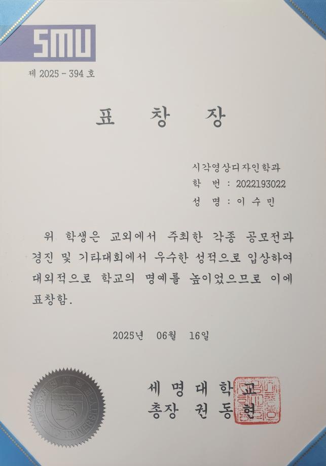 본문 시작 홈으로 학과자랑 학과소개 학과과정 시영소식 입학/취업 AI 학과자랑 SNS소통 홈페이지가이드 학과자랑 학과자랑 갤러리 공모전 동아리 졸업전시회 학과자랑 페이스북 트위터 프린트 2025년 총장표창장 수상 시각영상디자인학과 1189 2025-07-01 총장표창장 수상 - 이*민 연*현 문*빈 학생 시각영상디자인학과에서 3명이 수상하였습니다 모두 축하합니다 목록 이전충북과기원, 2025 충청북도 생성형 AI그림 그리기 경진대회- 신희경교수님 대상 수상 다음 2025 하계 현장실습 학생 인터뷰 - 세명네이처_박*준 담당부서 : 시각영상디자인학과 담당자 : - 연락처 : 043-649-1726 최종수정일 : 2024-10-26 만족도조사 만족도 조사 이 페이지에서 제공하는 정보에 대하여 만족하시나요? 매우만족 만족 보통 불만족 매우불만족