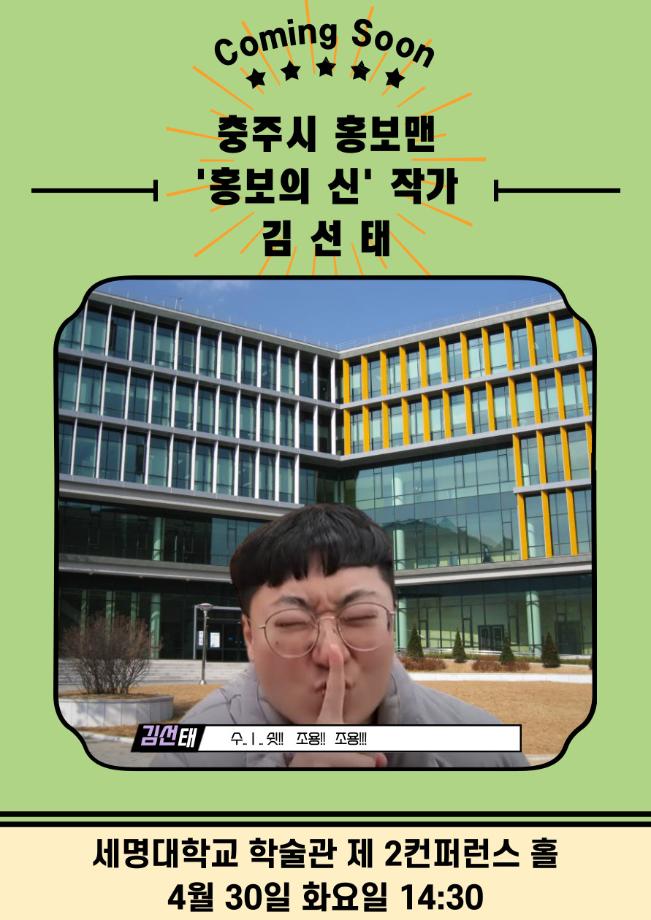 본문 시작 홈으로 MCC News 학과소개 교수소개 학과과정 MCC News MCC SNS 홈페이지가이드 미디어 정보통 학과 및 재학생 교수 및 졸업생 미디어 정보통 미디어 정보통 페이스북 트위터 프린트 ★☆★ [Book 콘서트] '김선태 충TV' Book 콘서트에 초대합니다 디지털콘텐츠창작학과 1749 2024-04-29 [Book 콘서트] '김선태 (충TV)' Book 콘서트에 초대합니다. 학술정보원(도서관)에서는 '김선태' 작가 (유튜브: 충주시 홍보맨)를 초청하여 북콘서트를 진행합니다. - 일시 : 2024. 4. 30. (화) 오후 2시 30분 - 장소 : 학술관 제2컨퍼런스홀 - 문의 : 043) 649-7009 / 학술정보원 많은 관심 부탁드립니다. *^^* 목록 이전제30회 커뮤니케이션 디자인 국제 공모전 다음 세명대학교 민송도서관 갤러리홀 전시회 [시대별 베스트셀러] 담당부서 : 미디어콘텐츠창작학과 담당자 : - 연락처 : 043-649-1741 최종수정일 : 2024-10-26 만족도조사 만족도 조사 이 페이지에서 제공하는 정보에 대하여 만족하시나요? 매우만족 만족 보통 불만족 매우불만족