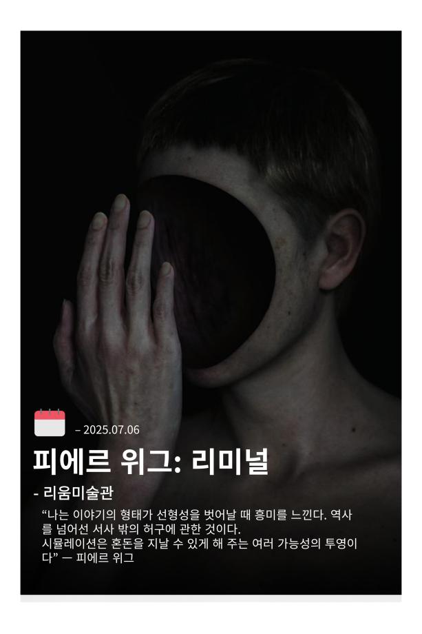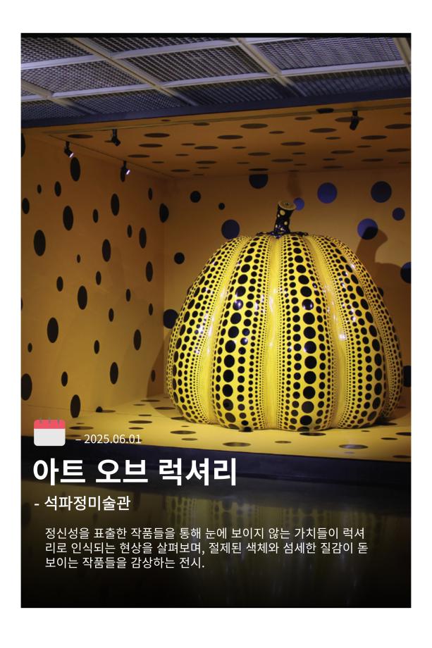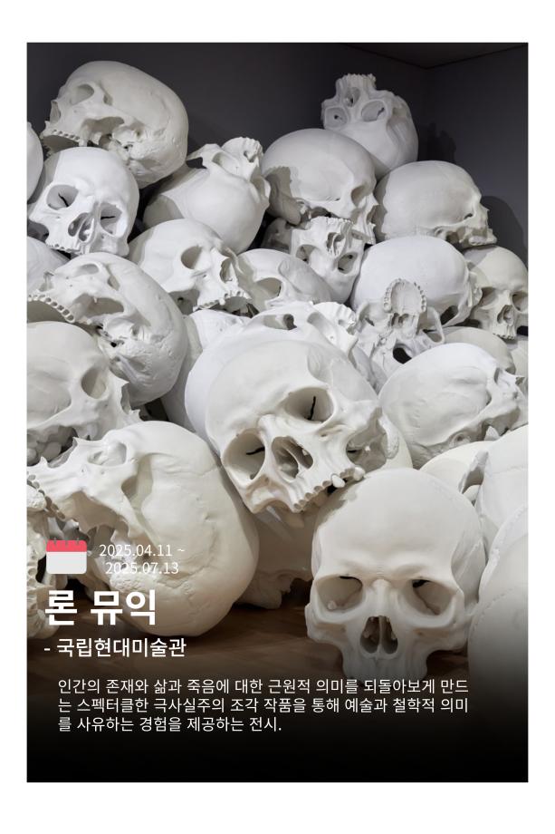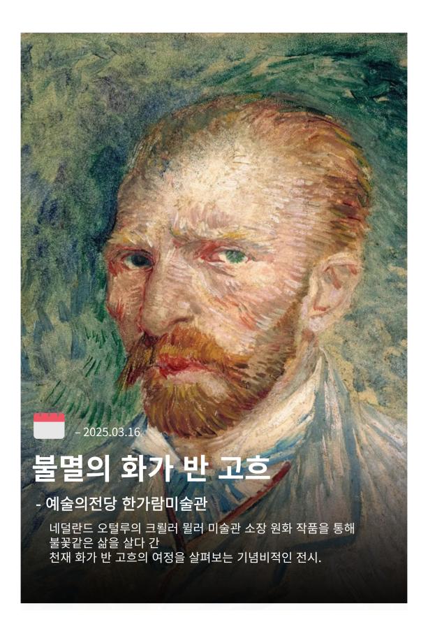 본문 시작 홈으로 MCC News 학과소개 교수소개 학과과정 MCC News MCC SNS 홈페이지가이드 미디어 정보통 학과 및 재학생 교수 및 졸업생 미디어 정보통 미디어 정보통 페이스북 트위터 프린트 우리과 학생이라면 한 번 가볼만한 전시회 추천!🫠 미디어콘텐츠창작학과 2188 2025-03-11 새학기도 시작한 기념으로 전시회도 한 번 갔다와보는건 어떨까요?🎨 1.불멸의 화가 반 고흐 2.피에르 위그:리미널 3.론 뮤익 4.아트 오브 럭셔리 5.인상파, 모네에서 미국으로 6.워너 브롱크호스트 추가적인 정보들은 학과 인스타그램을 참고해주세요! @SMU_MCC 목록 이전📚2025 광화문글판 대학생 에세이 공모전 (교보생명)✒ 다음 2025학년도 제천시장학금 신청 및 제천시 신규 전입 안내 담당부서 : 미디어콘텐츠창작학과 담당자 : - 연락처 : 043-649-1741 최종수정일 : 2024-10-26 만족도조사 만족도 조사 이 페이지에서 제공하는 정보에 대하여 만족하시나요? 매우만족 만족 보통 불만족 매우불만족