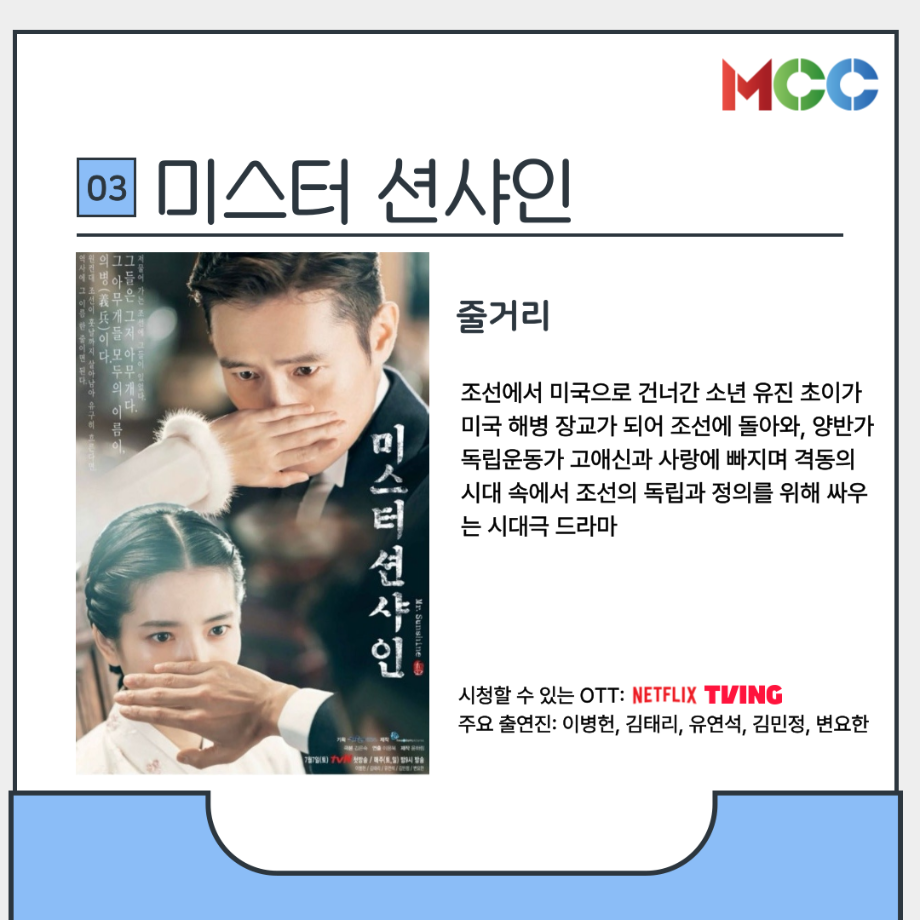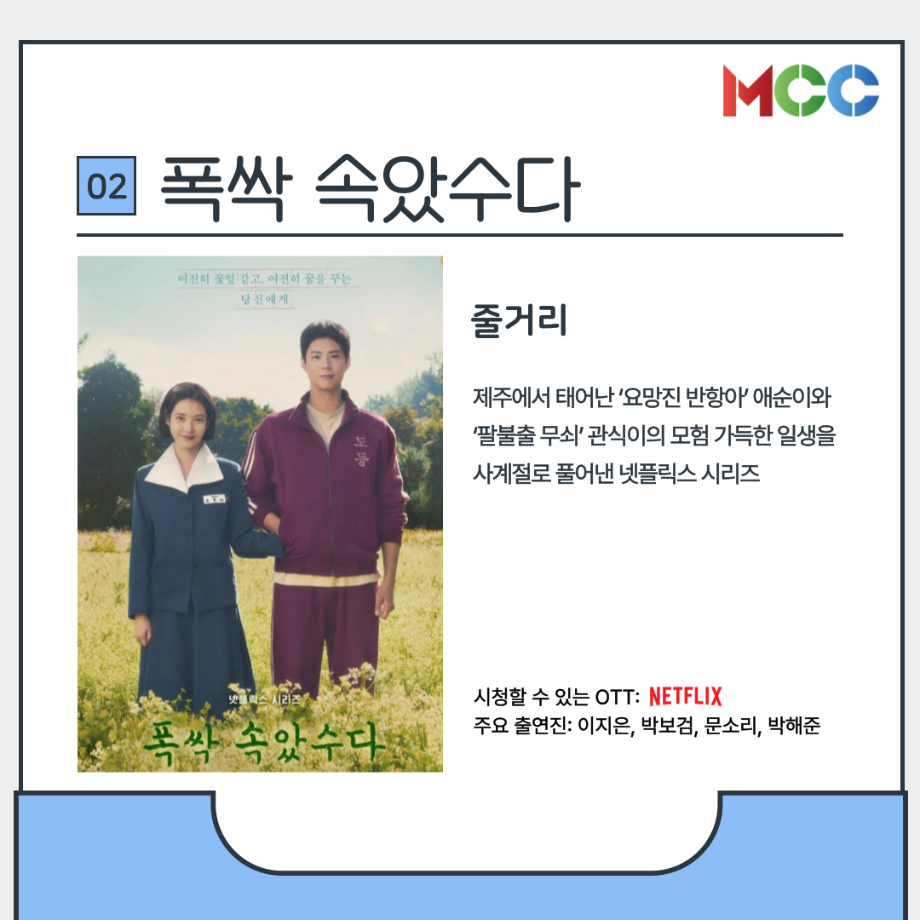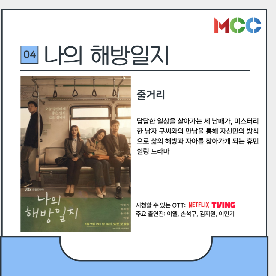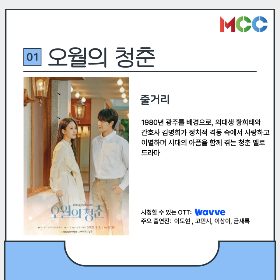 본문 시작 홈으로 MCC News 학과소개 교수소개 학과과정 MCC News MCC SNS 홈페이지가이드 미디어 정보통 학과 및 재학생 교수 및 졸업생 미디어 정보통 미디어 정보통 페이스북 트위터 프린트 힐링이 필요한 미콘창을 위한 드라마 추천 미디어콘텐츠창작학과 1423 2025-05-09 힐링이 필요한 미콘창 학생들이 볼만한 드라마를 추천드립니다 중간고사도 끝났으니 쉬어갈 시간 날씨가 따뜻해지는 요즘 마음이 따듯해지는 드라마 작품을 추천해드립니다 1. 오월의 청춘 2. 폭싹 속았수다 3. 나의 해방일지 4. 미스터 선샤인 5. 그해 우리는 자세한 내용은 미콘창 인스타그램에서 확인해주세요 @smu_mcc 목록 다음 2025 충청북도 60초 영상 공모전 다음 2025년 충북영상자서전 담당부서 : 미디어콘텐츠창작학과 담당자 : - 연락처 : 043-649-1741 최종수정일 : 2024-10-26 만족도조사 만족도 조사 이 페이지에서 제공하는 정보에 대하여 만족하시나요? 매우만족 만족 보통 불만족 매우불만족