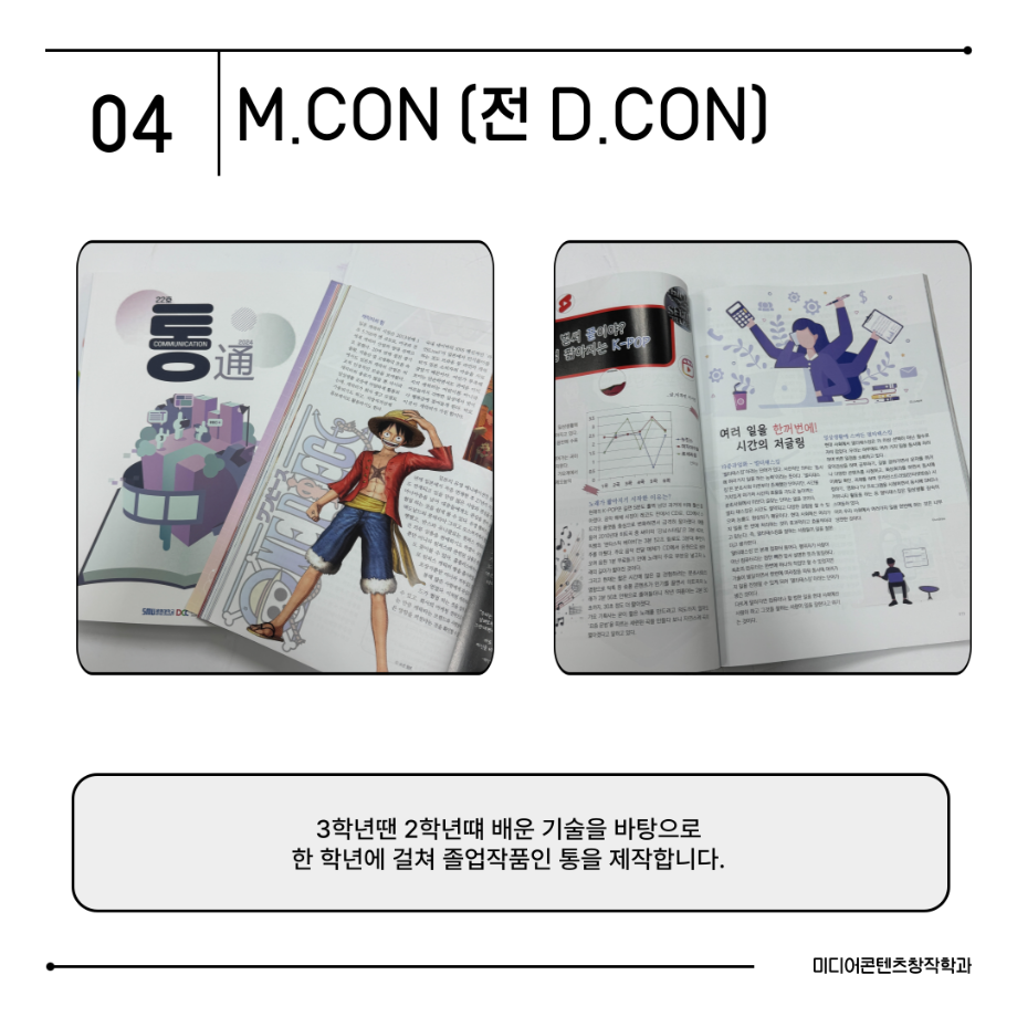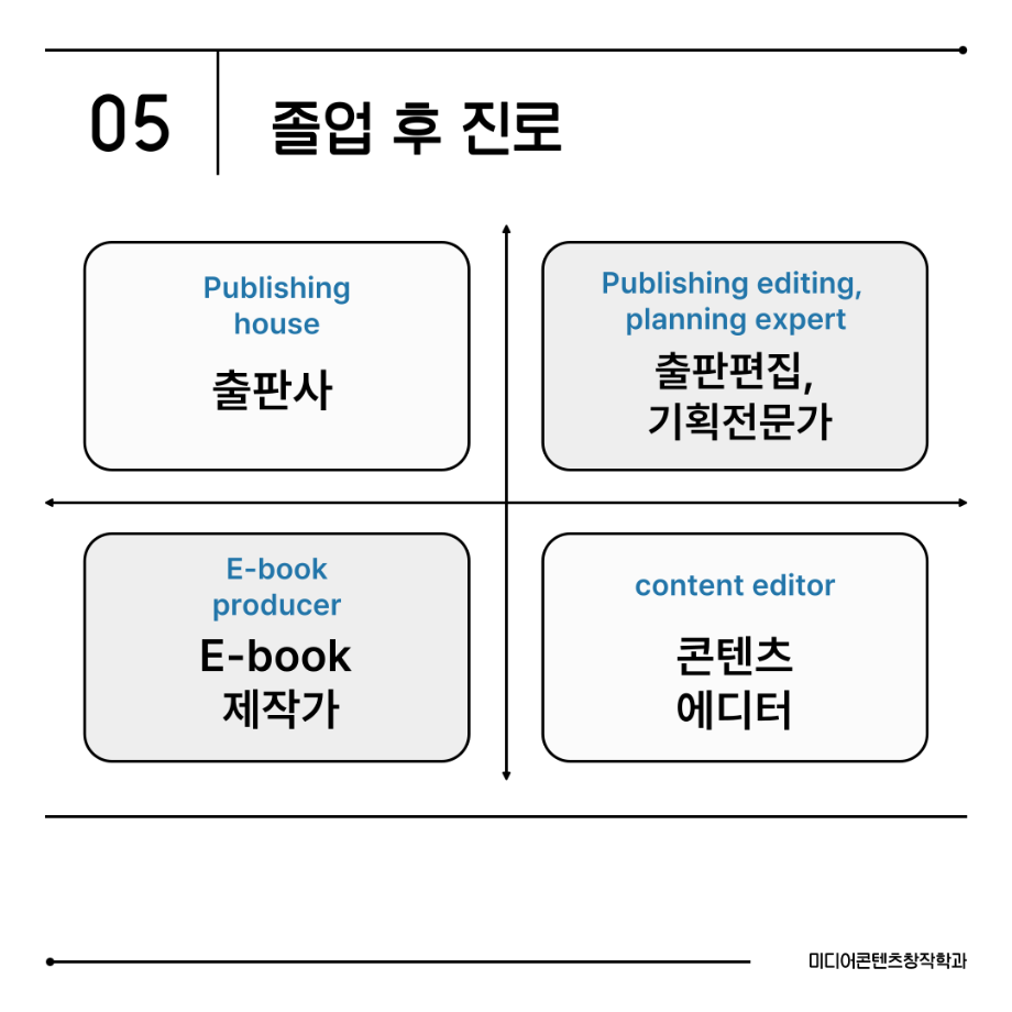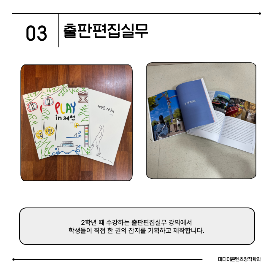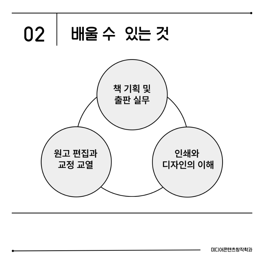 본문 시작 홈으로 MCC News 학과소개 교수소개 학과과정 MCC News MCC SNS 홈페이지가이드 미디어 정보통 학과 및 재학생 교수 및 졸업생 미디어 정보통 미디어 정보통 페이스북 트위터 프린트 📖미디어콘텐츠창작학과 | 출판 전공 미디어콘텐츠창작학과 1016 2025-08-19 출판 전공에서는 원고 편집, 기획, 디자인까지 책 제작의 모든 과정을 직접 경험합니다. 한 권의 책이 나오기까지는 수많은 손길이 필요합니다. 출판 전공은 글을 다듬고, 디자인하고, 기획하며 세상에 새로운 이야기를 전하는 과정을 배우는 곳입니다. 목록 이전경험이 실력이 되는 세명대학교 다음 📖 미디어콘텐츠창작학과 | 소설 전공 담당부서 : 미디어콘텐츠창작학과 담당자 : - 연락처 : 043-649-1741 최종수정일 : 2024-10-26 만족도조사 만족도 조사 이 페이지에서 제공하는 정보에 대하여 만족하시나요? 매우만족 만족 보통 불만족 매우불만족