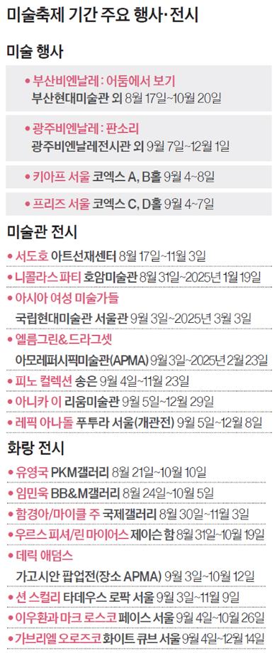 오는 9월 국내 미술 애호가들은 즐거운 비명을 지르게 될 것이다. 국내 연례 미술장터의 대표인 키아프 서울과 프리즈 서울이 4일에 동시 개막하고 며칠 뒤 7일에는 한국 국제미술제를 대표하는 광주비엔날레가 시작한다. 양대 산맥인 부산비엔날레는 지난 17일에 이미 개막했다. 여기에 맞춰 주요 미술관들과 화랑들도 국내외 스타 아티스트의 전시를 일제히 개막해 화려한 장외전을 펼친다. 중앙SUNDAY가 이들 중 꼭 봐야할 전시와 관전 포인트를 소개한다.