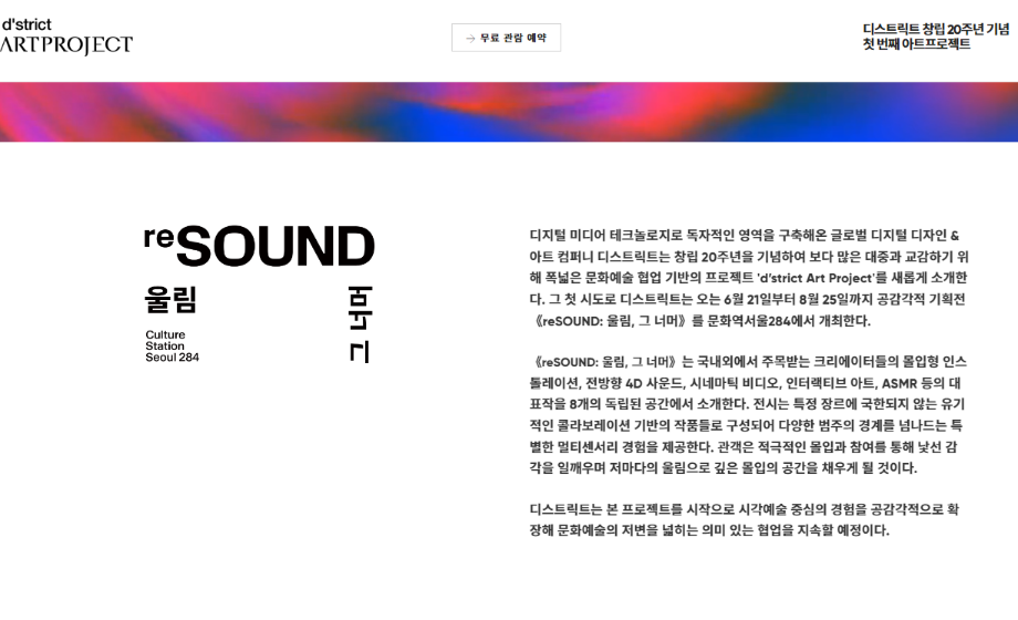 본문 시작 홈으로 AI 학과소개 학과과정 시영소식 입학/취업 AI 학과자랑 SNS소통 홈페이지가이드 디자인 정보 디자인 정보 AI 콘텐츠 연구소(AI 디자인) 디자인 정보 페이스북 트위터 프린트 디스트릭트 창립20주년 기념 첫번째 아트프로젝트 시각영상디자인학과 1857 2024-06-10 디스트릭트 창립20주년 기념 첫번째 아트프로젝트 https://artproject.dstrict.com/ 전시기간 2024. 06. 21 ~ 08. 25 관람시간 : 화 - 일요일 오전 11시 ~ 오후 7시 (매주 월요일 휴관) 사전예약 후 무료관람 목록 이전2024년, 인공지능은 우리의 일하는 방식을 바꾸었을까? 다음 <DDP 개관 10주년 기념 포스터> 전시 만족도조사 만족도 조사 이 페이지에서 제공하는 정보에 대하여 만족하시나요? 매우만족 만족 보통 불만족 매우불만족