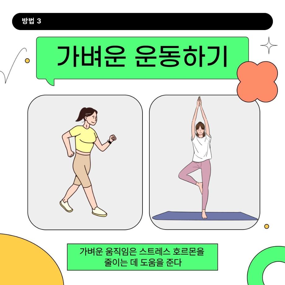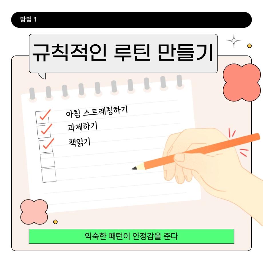 본문 시작 홈으로 학과 커뮤니티 학부소개 교수소개 교육목표 입학안내 학과 커뮤니티 대학원 커뮤니티 홈페이지가이드 학과 갤러리 학과소식 학사일정 학과 갤러리 학과 갤러리 페이스북 트위터 프린트 스트레스를 줄이는 5가지 방법 상담심리학과 1676 2025-02-12 1. 규칙적인 루틴 만들기 2. 명상하기 3. 가벼운 운동하기 4. 감정 기록하기 5. 취미 활동 하기 스트레스는 이렇게 간단한 방법으로도 줄일 수 있습니다. 이 방법 외에도 여러분에게 맞는 방법을 찾아 스트레스를 조절해 보세요! 목록 이전2월 학사일정 다음 2025 신입생 꿈설계학기 만족도조사 만족도 조사 이 페이지에서 제공하는 정보에 대하여 만족하시나요? 매우만족 만족 보통 불만족 매우불만족