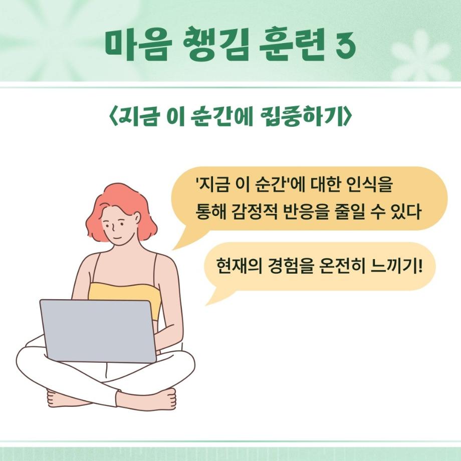 마음 챙김은 스트레스 감소, 정서 안정, 집중력 향상의 효과가 있으며