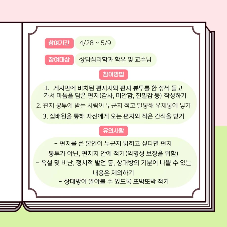 본문 시작 홈으로 학과 커뮤니티 학부소개 교수소개 교육목표 입학안내 학과 커뮤니티 대학원 커뮤니티 홈페이지가이드 학과 갤러리 학과소식 학사일정 학과 갤러리 학과 갤러리 페이스북 트위터 프린트 상담심리학과 표현데이 이벤트 상담심리학과 481 2025-04-29 안녕하세요 세명대학교 상담심리학과입니다! 여러분은 평소 고마웠던 마음이나 미안했던 감정을 전하고 싶었지만 말로 표현하기 어려웠던 순간이 있나요? 학과 동아리 GRIT에서 여러분의 따뜻한 마음을 전할 수 있도록 작은 이벤트를 준비했습니다! 참여기간: 4/28 ~ 5/9 참여대상: 상담심리학과 학우 및 교수님 짧은 한 마디로도 진심을 전할 수 있습니다! 많은 관심 부탁드립니다 :) 목록 다음 2025 상담심리학과 MT 다음 상담심리학과 표현데이 활동 소감 만족도조사 만족도 조사 이 페이지에서 제공하는 정보에 대하여 만족하시나요? 매우만족 만족 보통 불만족 매우불만족