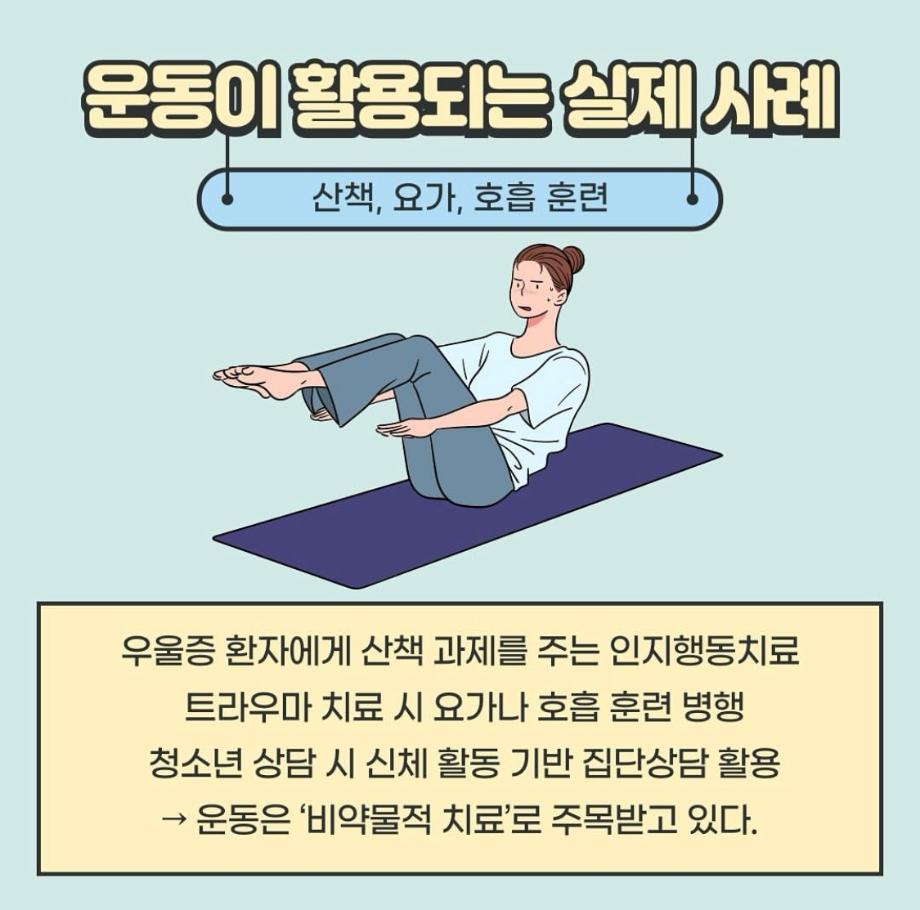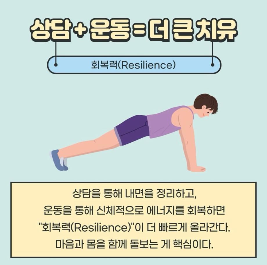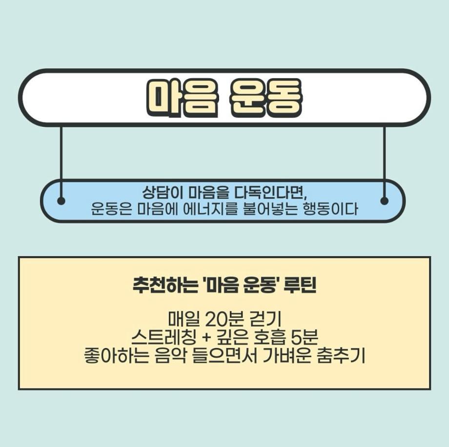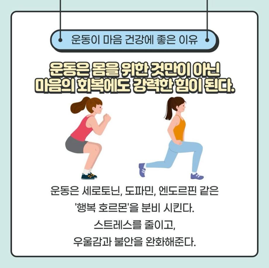 본문 시작 홈으로 학과 커뮤니티 학부소개 교수소개 교육목표 입학안내 학과 커뮤니티 대학원 커뮤니티 홈페이지가이드 학과 갤러리 학과소식 학사일정 학과 갤러리 학과 갤러리 페이스북 트위터 프린트 운동과 상담심리 상담심리학과 823 2025-05-17 안녕하세요 세명대학교 상담심리학과 학생회 오비르입니다 ! 오늘은 운동과 상담심리의 관계에 대해 알려드리겠습니다. 몸을 움직이면 마음도 움직인다! 운동은 세로토닌, 도파민, 엔도르핀 같은 '행복 호르몬'을 분비시켜 스트레스를 줄이고, 우울감과 불안을 완화해 준다고 합니다. 몸과 마음이 지쳐있다면 운동을 통해 회복하는 시간을 가져 보는 건 어떨까요? 목록 이전윤리적 딜레마 & 해결방법 다음 음악이 심리에 미치는 영향 만족도조사 만족도 조사 이 페이지에서 제공하는 정보에 대하여 만족하시나요? 매우만족 만족 보통 불만족 매우불만족