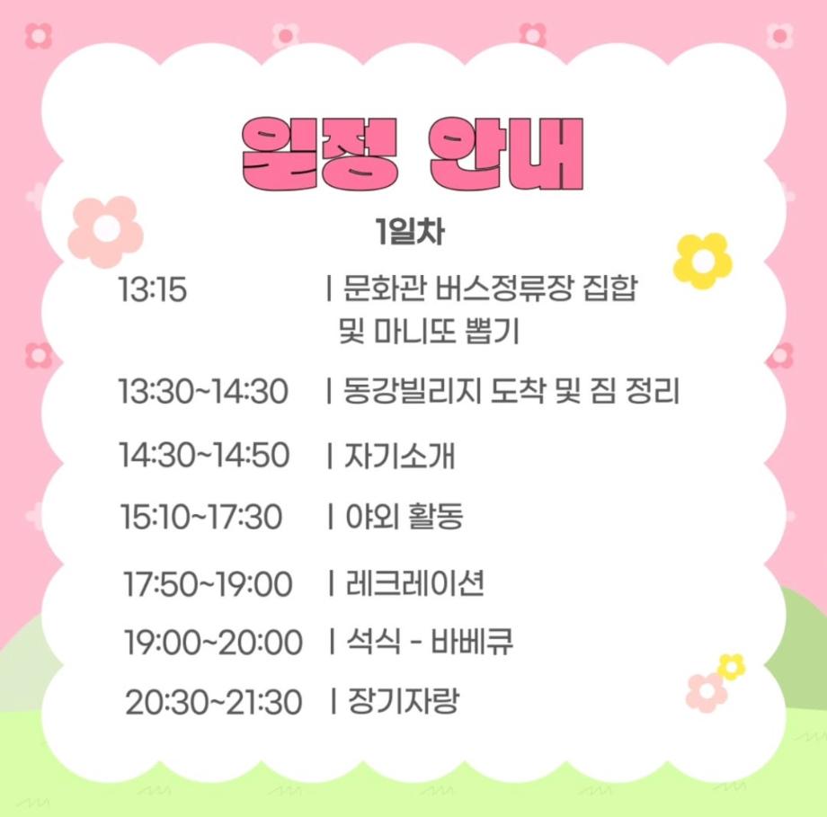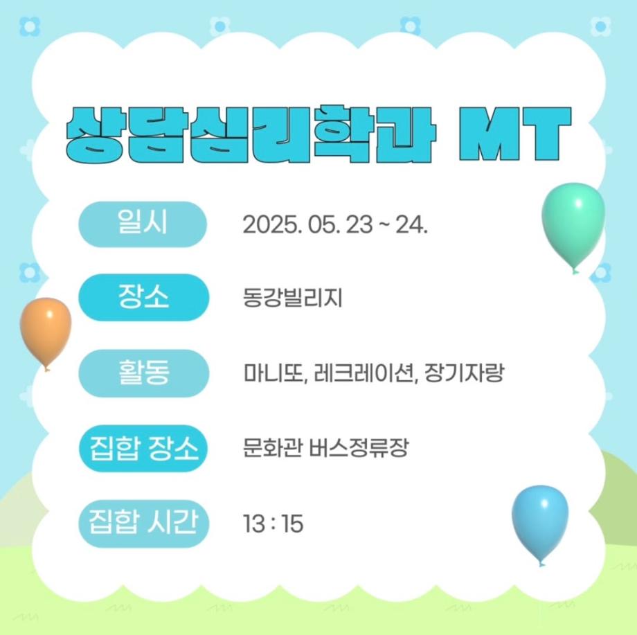 본문 시작 홈으로 학과 커뮤니티 학부소개 교수소개 교육목표 입학안내 학과 커뮤니티 대학원 커뮤니티 홈페이지가이드 학과 갤러리 학과소식 학사일정 학과 갤러리 학과 갤러리 페이스북 트위터 프린트 상담심리학과 MT 일정 안내 상담심리학과 855 2025-05-22 안녕하세요 상담심리학과 학생회 오비르입니다 ! 2025년 상담심리학과 MT 일정에 대해 안내드립니다 ~ 일시: 2025. 5. 23. (금) ~ 24. (토) 장소: 동강빌리지 (강원 영월군 영월읍 동강로 225) 집합 장소: 세명대학교 문화관 집합 시간: 13시 15분 집합 시간에 맞춰 모두 늦지 않게 와주시길 바랍니다. 상담심리학과의 첫 MT인 만큼 사고 없이 안전하고 즐겁게 다녀왔으면 좋겠습니다 ღゝ◡╹)ノ♡ 목록 이전음악이 심리에 미치는 영향 다음 2025 상담심리학과 MT 만족도조사 만족도 조사 이 페이지에서 제공하는 정보에 대하여 만족하시나요? 매우만족 만족 보통 불만족 매우불만족