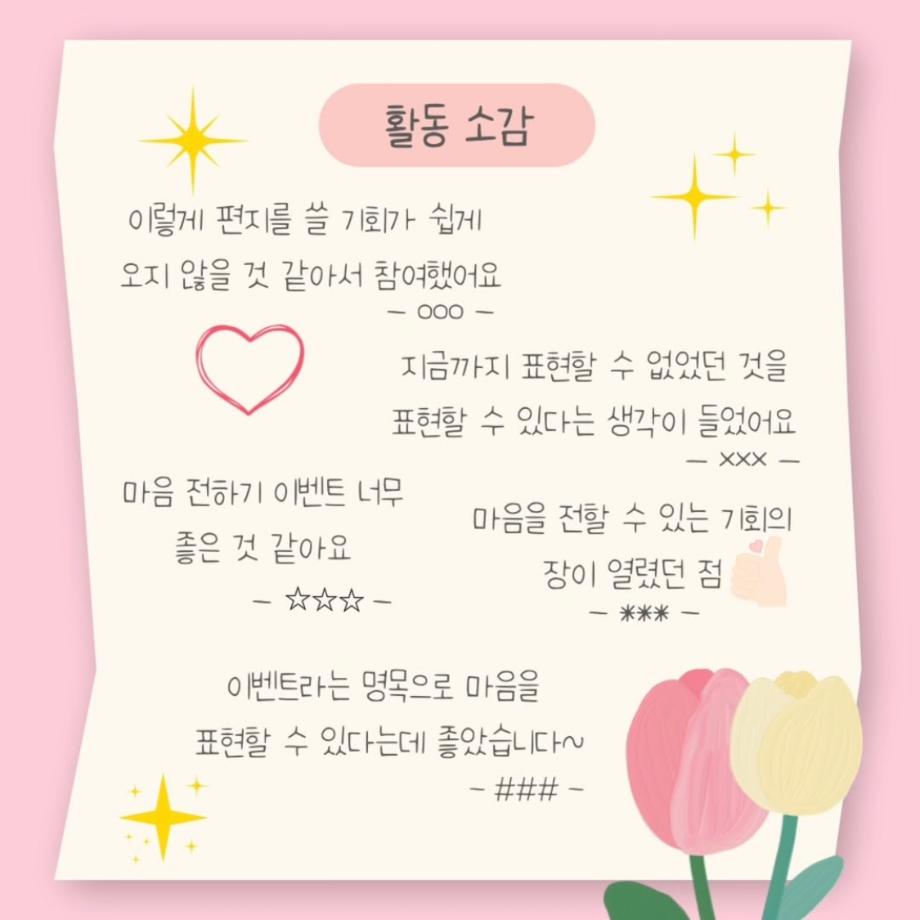 본문 시작 홈으로 학과 커뮤니티 학부소개 교수소개 교육목표 입학안내 학과 커뮤니티 대학원 커뮤니티 홈페이지가이드 학과 갤러리 학과소식 학사일정 학과 갤러리 학과 갤러리 페이스북 트위터 프린트 상담심리학과 표현데이 활동 소감 상담심리학과 601 2025-06-02 안녕하세요 세명대학교 상담심리학과입니다! 상담심리학과의 유일한 기획 동아리 GRIT에서 4월 28일부터 5월 9일까지 표현데이 이벤트를 진행했습니다! 평소 마음을 전하지 못했던 대상에게 편지로 마음을 전할 수 있어 모두에게 의미 있는 시간이 되었던 것 같습니다 :) 앞으로도 다양한 이벤트를 진행한다고 하니 많은 관심 부탁드립니다~ 목록 이전상담심리학과 표현데이 이벤트 다음 6월 학사일정 만족도조사 만족도 조사 이 페이지에서 제공하는 정보에 대하여 만족하시나요? 매우만족 만족 보통 불만족 매우불만족