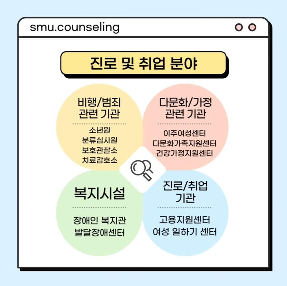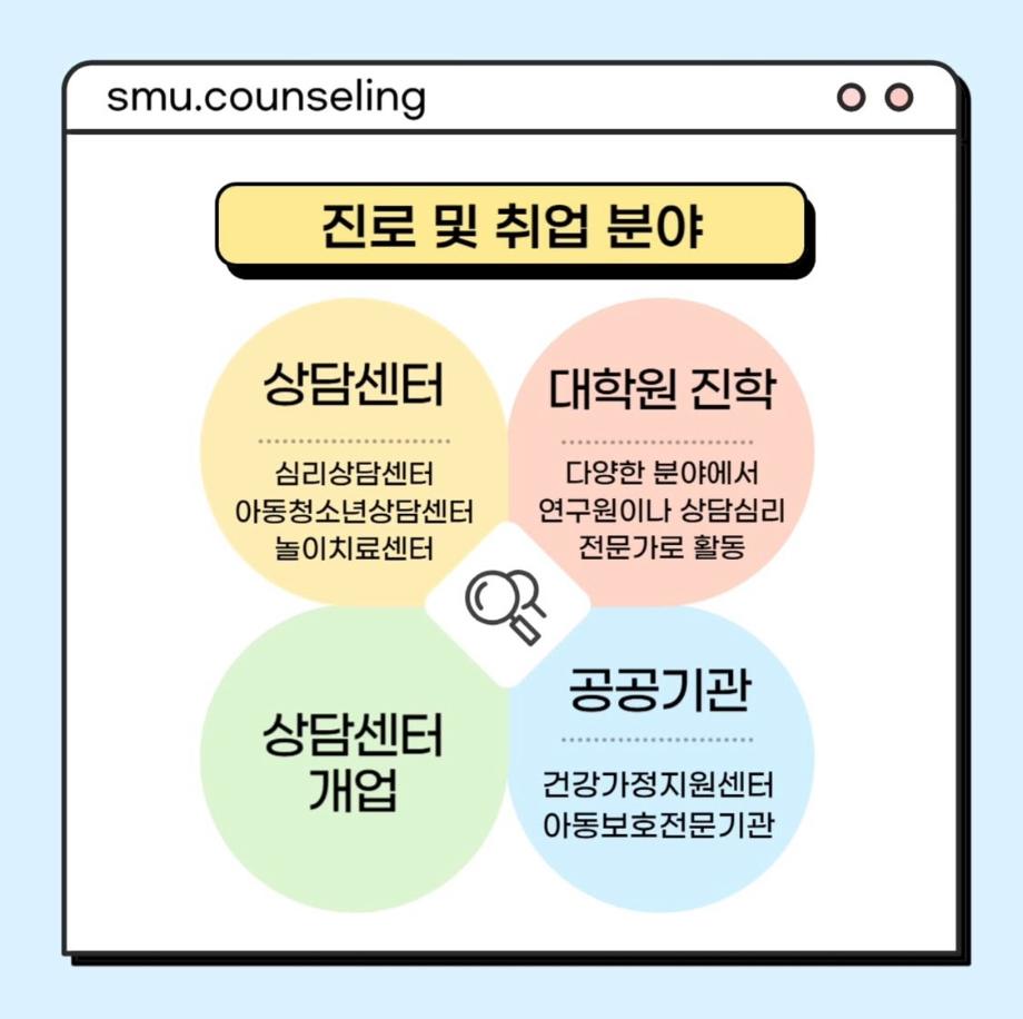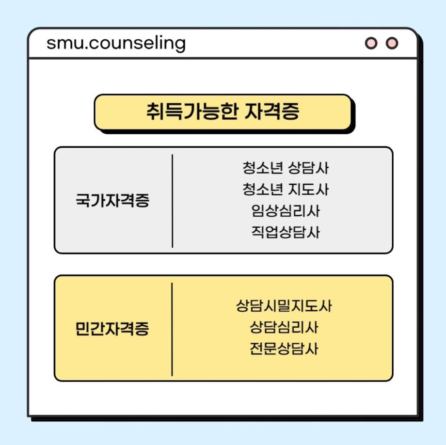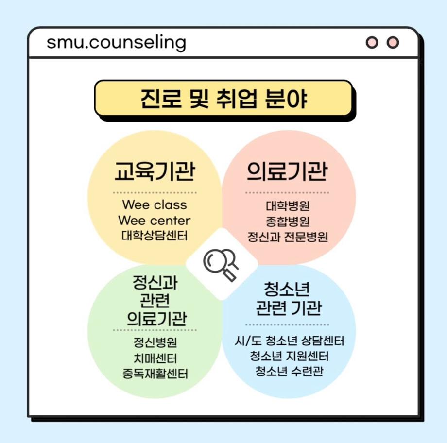 본문 시작 홈으로 학과 커뮤니티 학부소개 교수소개 교육목표 입학안내 학과 커뮤니티 대학원 커뮤니티 홈페이지가이드 학과 갤러리 학과소식 학사일정 학과 갤러리 학과 갤러리 페이스북 트위터 프린트 자격증&진로 소개 상담심리학과 756 2025-07-30 안녕하십니까 세명대학교 상담심리학과입니다! 오늘은 상담사가 되기 위해 필요한 자격증, 취업 분야를 소개해드리려고 합니다. 상담심리학과 졸업 후에는 교육기관, 의료기관, 복지시설 등 다양한 분야에서 활동할 수 있습니다 :) 목록 이전[현직자 인터뷰] 평창군청소년상담복지센터 다음 [현직자 인터뷰] 육군 상담사 만족도조사 만족도 조사 이 페이지에서 제공하는 정보에 대하여 만족하시나요? 매우만족 만족 보통 불만족 매우불만족